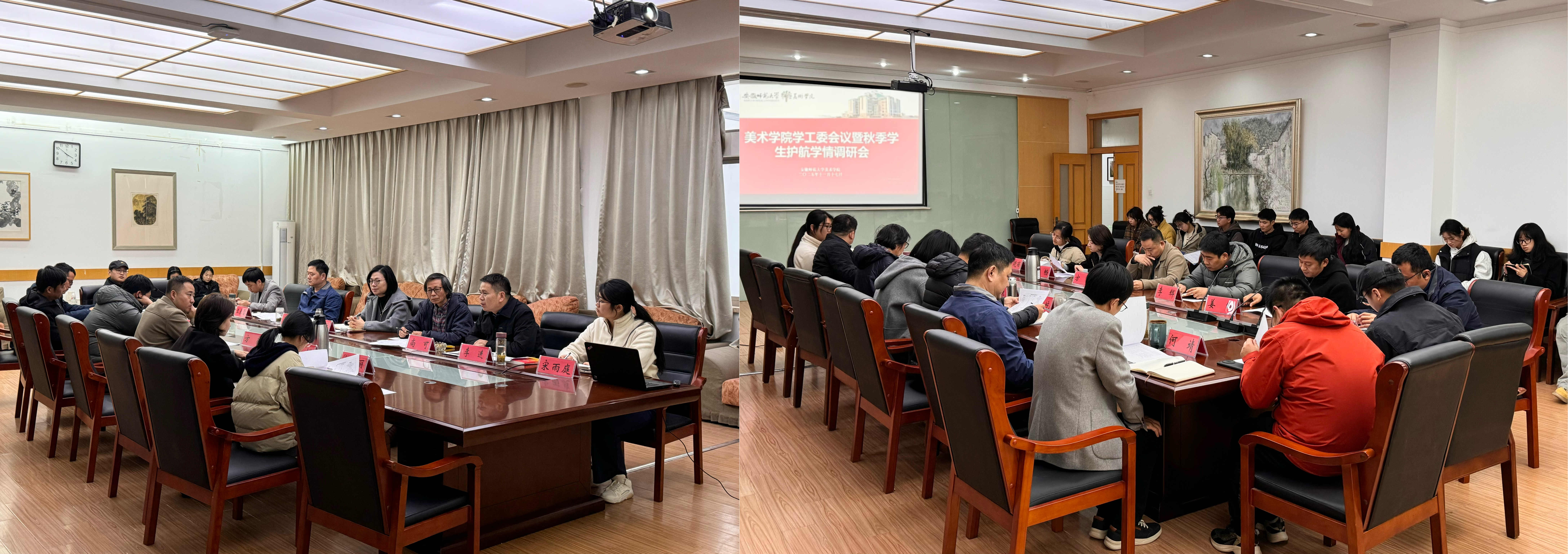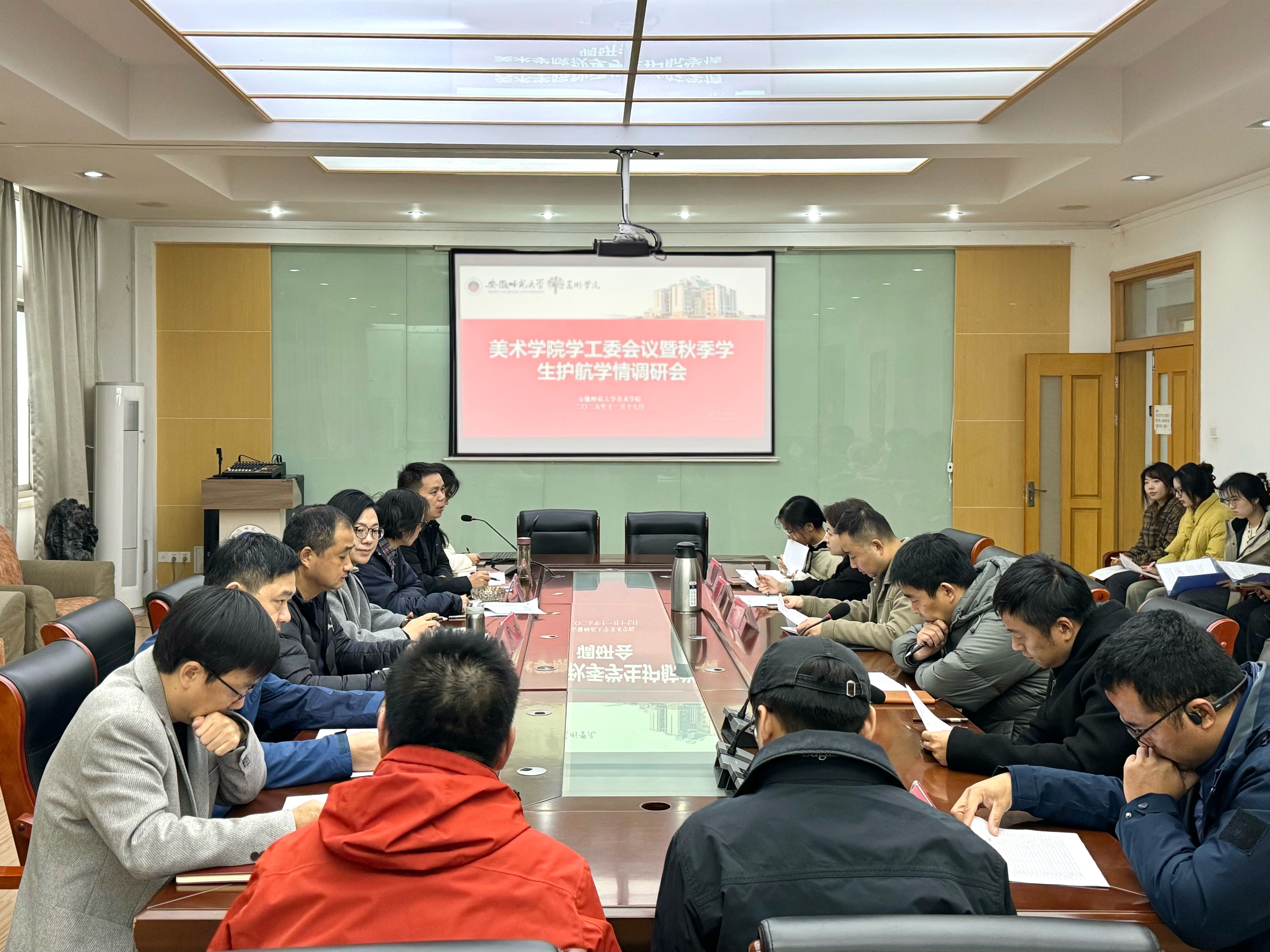 为扎实推进新时代立德树人工程,全面落实大学生护航行动计划,精准掌握学生学情动态与成长需求,11月17日下午,美术学院召开学工委会议暨秋季学期护航学情调研座谈会。学院党政领导班子、各专业负责人、相关科室工作人员、教师代表及各年级学生代表参会,会议由院党委副书记李进主持。