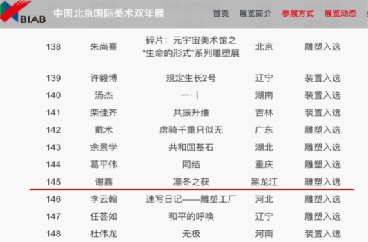 近日,中国美术家协会官网公布了“第十届中国北京国际美术双年展主题展”作品复评结果。我院谢鑫老师的雕塑作品《凛冬之获》成功入选。