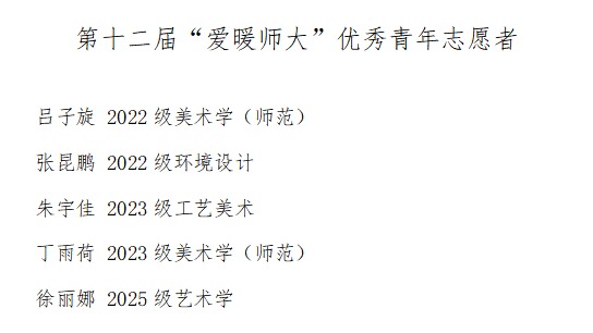 此次获评的优秀青年志愿者分别为:2022级美术学(师范)专业吕子旋、2022级环境设计专业张昆鹏、2023级工艺美术专业朱宇佳、2023级美术学(师范)专业丁雨荷、2025级艺术学专业徐丽娜。在各类志愿服务活动中,他们精准立足美术学科特色,将专业所长融入志愿行动全过程,以实际行动生动践行“奉献、友爱、互助、进步”的志愿精神,充分展现了美院学子的青春担当与温暖底色。希望全院更多学生以他们为榜样,主动投身志愿服务事业,用青春力量传递温暖温情,谱写美院志愿服务风采的崭新篇章。