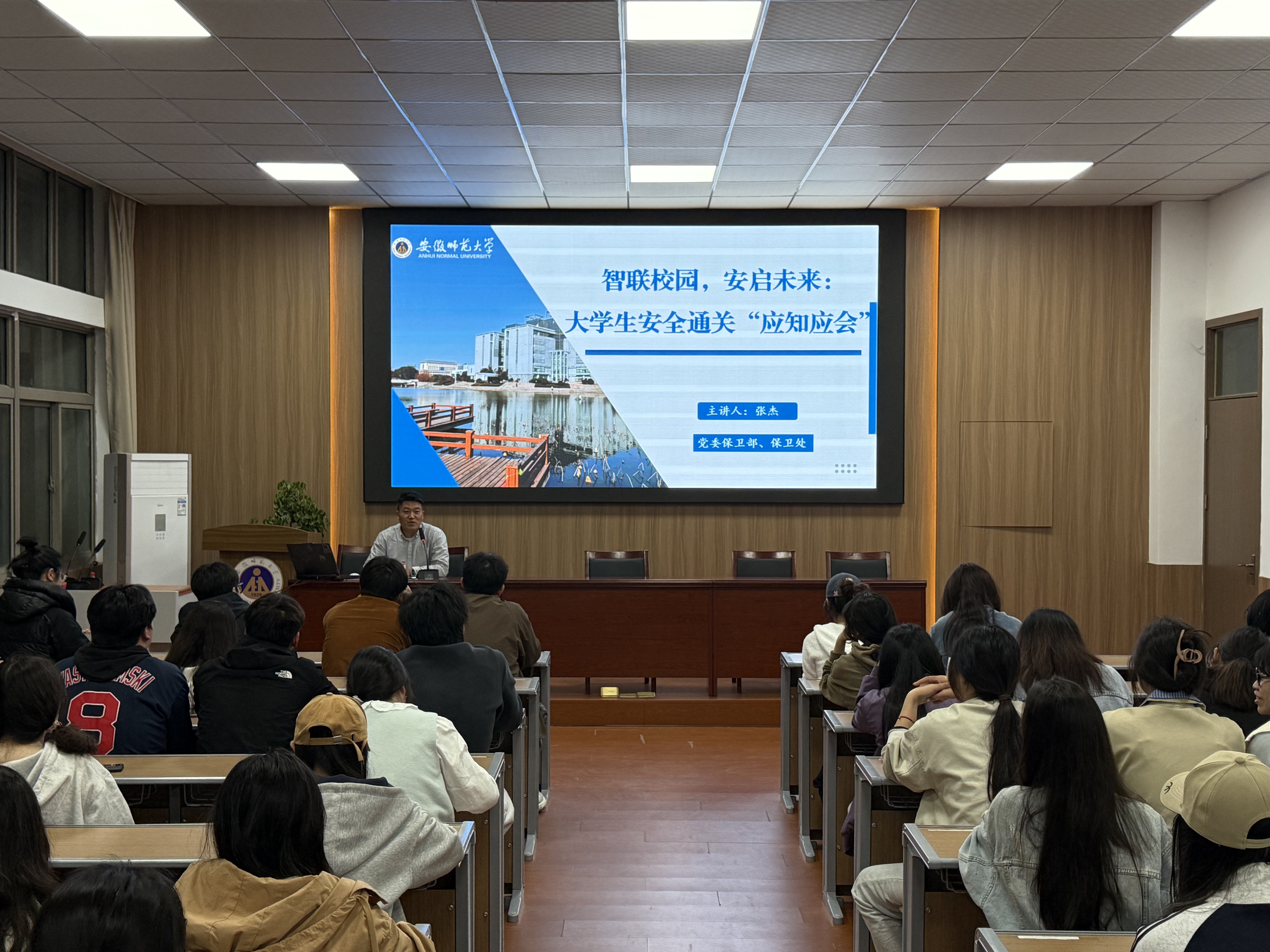 张杰以《智联校园 安启未来:大学生安全通关“应知应会”》为题,围绕校园交通安全、消防安全、反诈宣传等方面,结合校园真实案例进行安全警示教育,提醒同学们做好安全宣传与监督,防范校园安全事故。