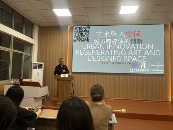 讲座伊始,唐克扬教授以“城市空间的‘媒体化’转型”为切入点,打破“艺术是独立创作、媒体是传播工具”的传统观念,提出“艺术与城市媒体的融合,是空间功能升级与审美需求提升的必然结果”。他引用了国内外典型实践案例,从探讨创新城市的必要性、界定优质文化与艺术的标准、剖析其逻辑知识与经验等维度,具体解读了“艺术融入空间”的实践路径。从清华、北大校园设计,到上海街头的互动装置,再到南方科技大学的标牌设计,这些案例均印证了城市媒体从“信息传播载体”升级为“艺术表达平台”,使艺术真正走出生活,融入环境。